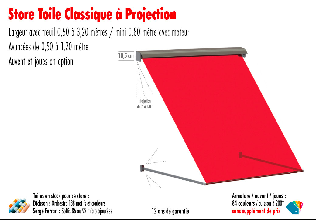 Voir : caractéristiques des toiles MATEST et présentation visuelle des toiles MATEST - soit motorisation SOMFY, soit manivelle (intérieure ou extérieure)